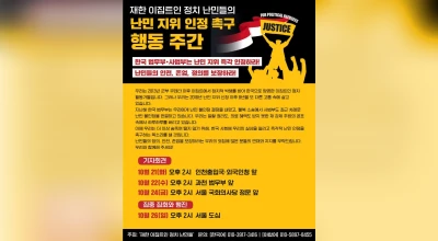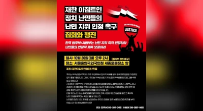 재한 이집트인 정치 난민들의 난민 지위 인정 촉구 행동 주간- 한국 법무부·사법부는 난민 지위 즉각 인정하라! - 난민들의 안전, 존엄, 정의를 보장하라! 기자회견 10월 21일(화) 오후 2시 인천출입국·외국인청 앞 10월 22일(수) 오후 2시 과천 법무부 앞 10월 24일(금) 오후 2시 서울 국회의사당 정문 앞 집중 집회와 행진 10월 26…
