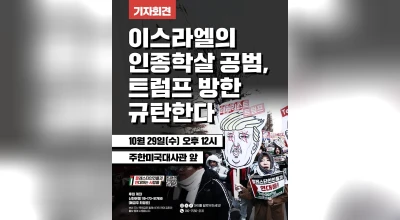 [기자회견]이스라엘의 인종학살 공범, 트럼프 방한 규탄한다! - 일시: 10월 29일(수) 오후 12시- 장소: 주한미국대사관 앞 [Press Conference]Condemning Trump's Visit to Korea, an Accomplice to Israel's Genocide!- Date: October 29(Wed), 12pm- Locat…