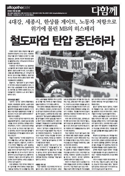 이명박은 어제 투쟁에 나선 공공부문 노조들에게 동시다발로 탄압의 칼을 휘 둘렀다. 철도노조뿐 아니라, 노조 설립신 고를 앞둔 통합공무원노조 사무실에 대 해서도 압수수색을 자행했고, 공공기관 역사상 최초로 한국노동연구원에 대한 직장폐쇄까지 단행했다!