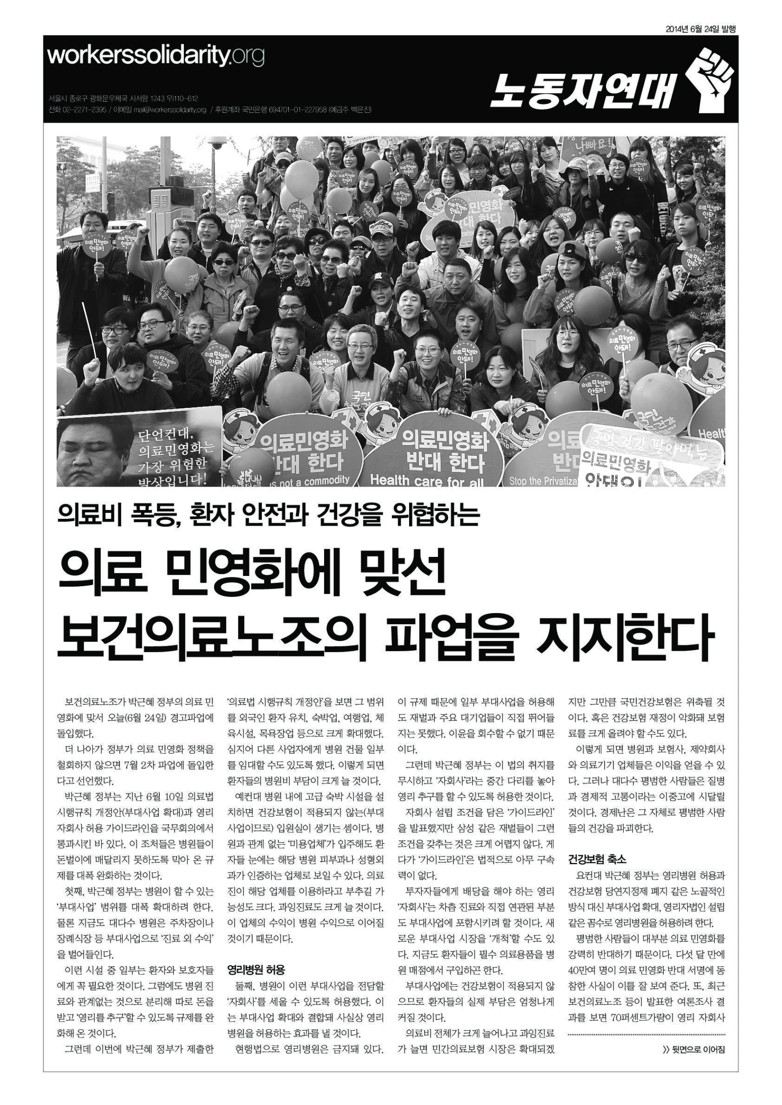 의료 민영화에 맞선 보건의료노조의 파업을 지지한다