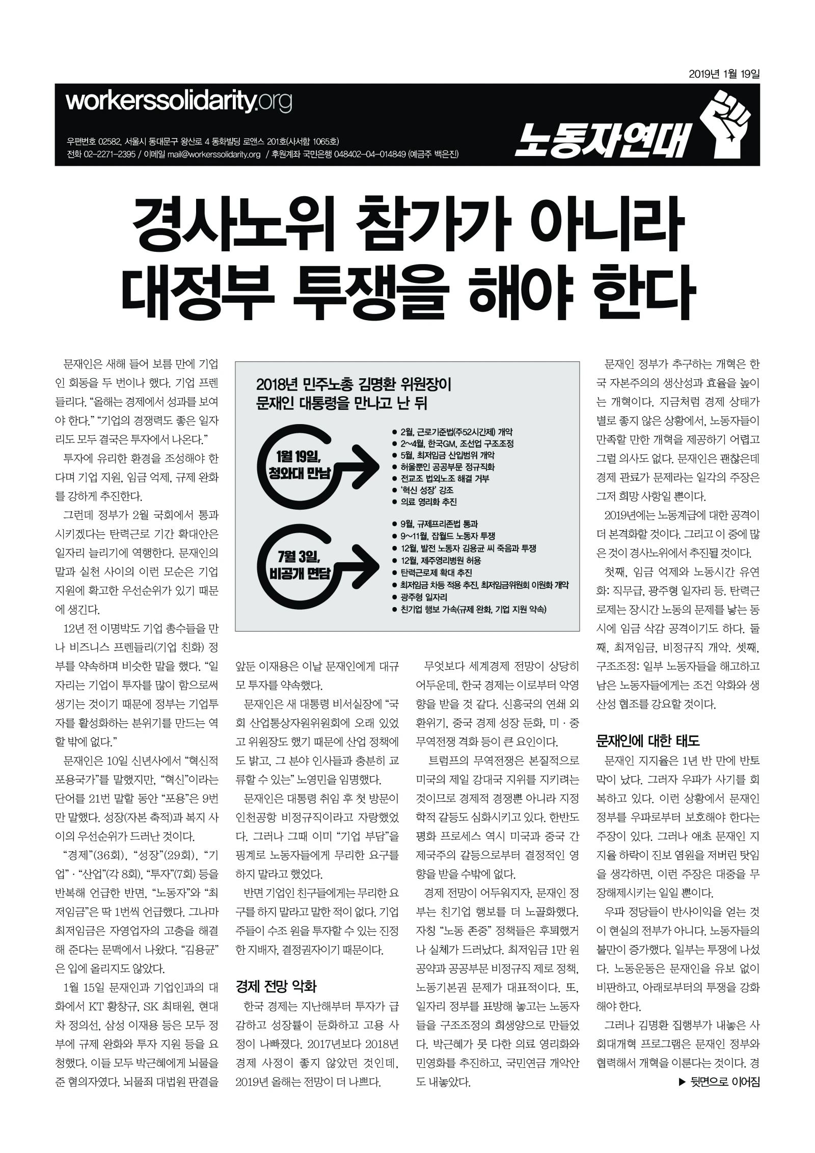 2019년 01월 19일 태안화력 청년 비정규직 노동자 故김용균 투쟁승리 1.19 전국노동자대회에서 배포한 리플릿입니다.