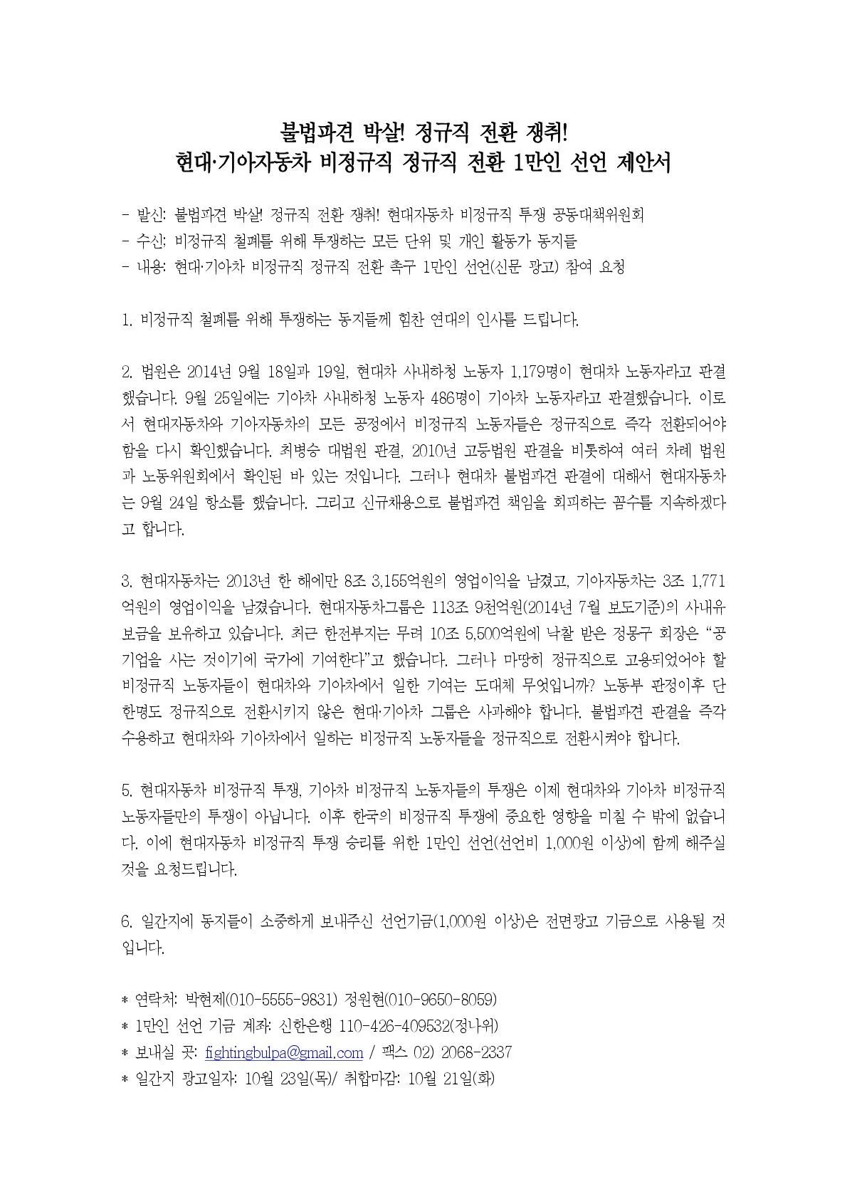 현대·기아자동차 비정규직 정규직 전환 1만인 선언 제안서