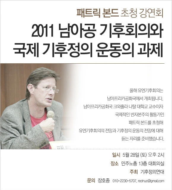 남아프리카공화국 크와줄라 니탈 대학교 교수이자 국제적인 반자본주의 활동가인 패트릭 본드를 초청해 유엔기후회의의 전망과 기후정의 운동의 전망에 대해 듣는 자리를 준비했습니다.