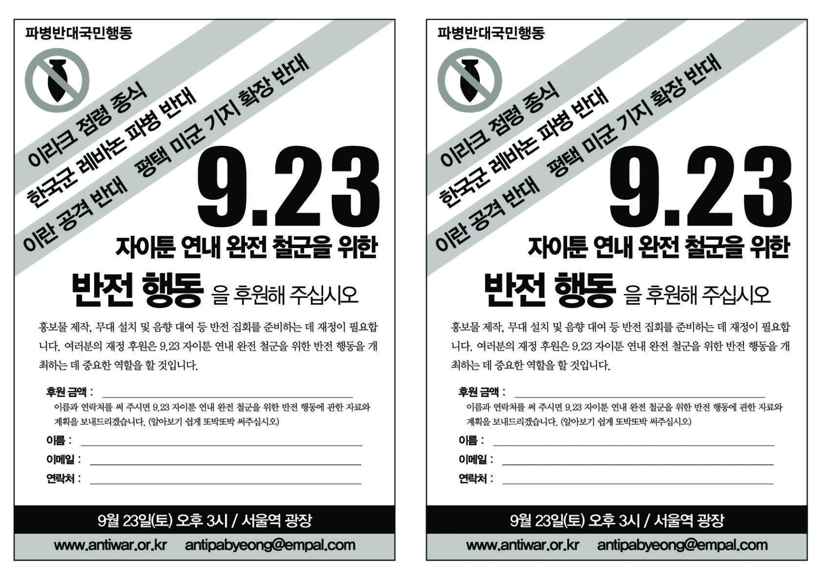 자이툰 연내 완전 철군을 위한 9.23 반전 행동 개인 후원서입니다.