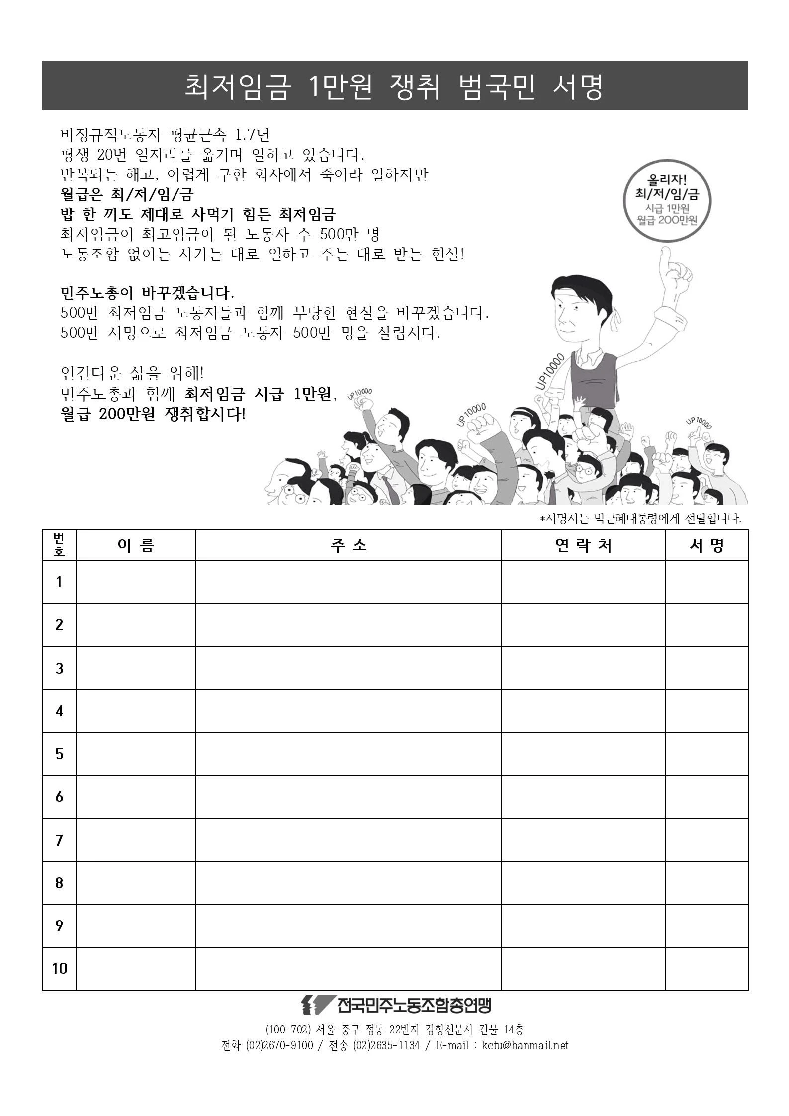 hwp 파일은 민주노총의 “최저임금 1만원 쟁취 범국민 서명용지” 페이지에 가서 다운로드하시면 됩니다.