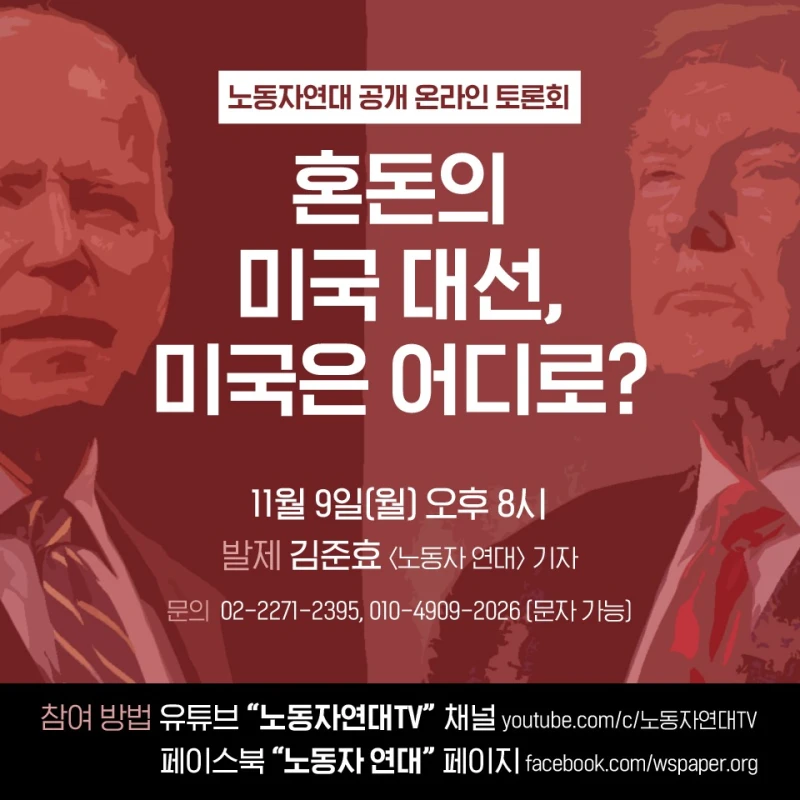 일시: 11월 9일(월) 오후 8시 발제: 김준효 〈노동자 연대〉 기자 문의: 02-2271-2395, 010-4909-2026 (문자 가능), wsorg@ws.or.kr 참여 방법: 유튜브 “노동자연대TV” 채널, 페이스북 “노동자 연대” 페이지