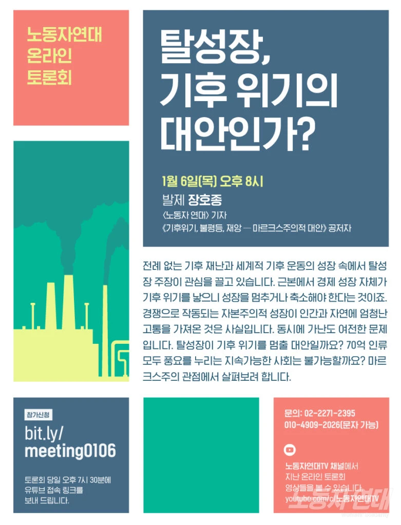 전례 없는 기후 재난과 세계적 기후 운동의 성장 속에서 탈성장 주장이 관심을 끌고 있습니다. 근본에서 경제 성장 자체가 기후 위기를 낳으니 성장을 멈추거나 축소해야 한다는 것이죠. 경쟁으로 작동되는 자본주의적 성장이 인간과 자연에 엄청난 고통을 가져온 것은 사실입니다. 동시에 가난도 여전한 문제입니다. 탈성장이 기후 위기를 멈출 대안일까요? 70억 인류 모두 풍요를 누리는 지속가능한 사회는 불가능할까요? 마르크스주의 관점에서 살펴보려 합니다.