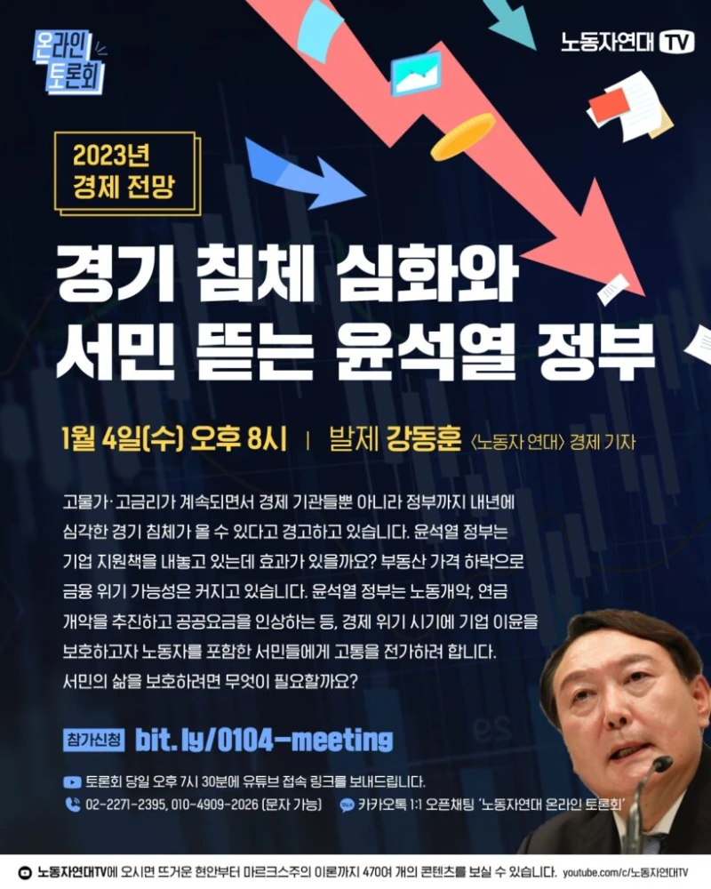 고물가·고금리가 계속되면서 경제 기관들뿐 아니라 정부까지 내년에 심각한 경기 침체가 올 수 있다고 경고하고 있습니다. 윤석열 정부는 기업 지원책을 내놓고 있는데 효과가 있을까요? 부동산 가격 하락으로 금융 위기 가능성은 커지고 있습니다. 윤석열 정부는 노동개악, 연금개악을 추진하고 공공요금을 인상하는 등, 경제 위기 시기에 기업 이윤을 보호하고자 노동자를 포함한 서민들에게 고통을 전가하려 합니다. 서민의 삶을 보호하려면 무엇이 필요할까요?