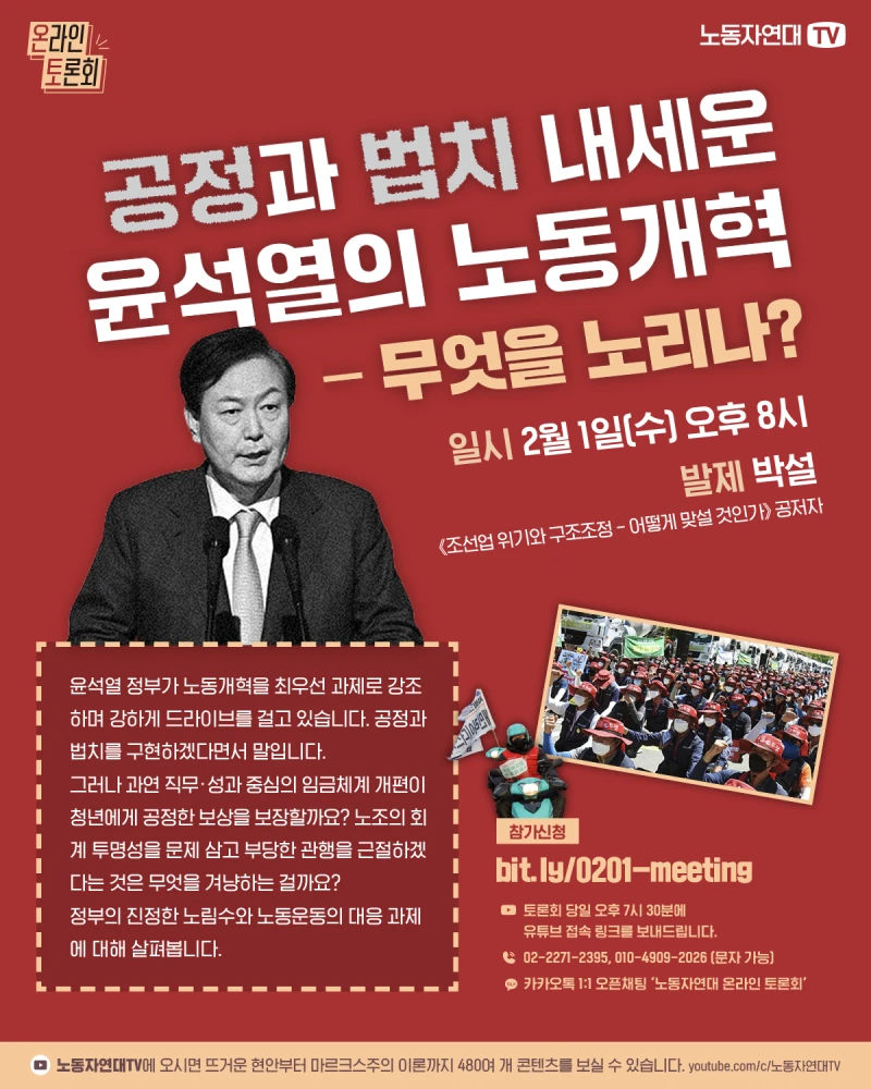 윤석열이 노동개혁을 최우선 과제로 강조하며 강하게 드라이브를 걸고 있습니다. 공정과 법치를 구현하겠다면서 말입니다. 그러나 과연 직무·성과 중심의 임금체계 개편이 청년에게 공정한 보상을 보장할까요? 노조의 회계 투명성을 문제삼고 부당한 관행을 근절하겠다는 것은 무엇을 겨냥하는 걸까요? 정부의 진정한 노림수와 노동운동의 대응 과제에 대해 살펴봅니다.