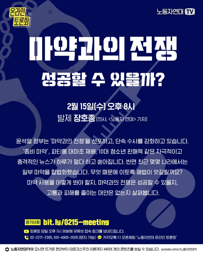 윤석열 정부는 ‘마약과의 전쟁’을 선포하고, 단속 수사를 강화하고 있습니다. ‘좀비 마약’, 파티룸 대마초 재배, 10대 청소년 판매책 같은 자극적이고 충격적인 뉴스가 하루가 멀다 하고 쏟아집니다. 반면 최근 몇몇 나라에서는 일부 마약을 합법화했습니다. 무엇 때문에 이토록 해법이 엇갈릴까요? 마약 사용을 어떻게 봐야 할지, 마약과의 전쟁은 성공할 수 있을지, 고통과 피해를 줄이는 대안은 없는지 살펴봅니다.