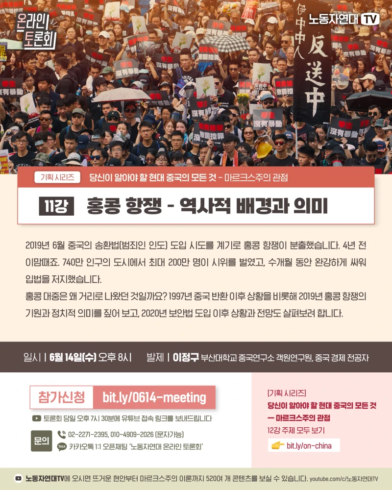 홍콩 대중은 왜 거리로 나왔던 것일까요? 1997년 중국 반환 이후 상황을 비롯해 2019년 홍콩 항쟁의 기원과 정치적 의미를 짚어 보고, 2020년 보안법 도입 이후 상황과 전망도 살펴보려 합니다.