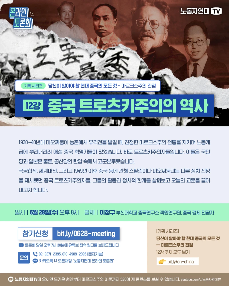 국공합작, 세계대전, 그리고 1949년 이후 중국 등에 관해 스탈린이나 마오쩌둥과는 다른 정치 전망을 제시했던 중국 트로츠키주의자들. 그들의 활동과 정치적 한계를 살펴보고 오늘의 교훈을 끌어내고자 합니다.
