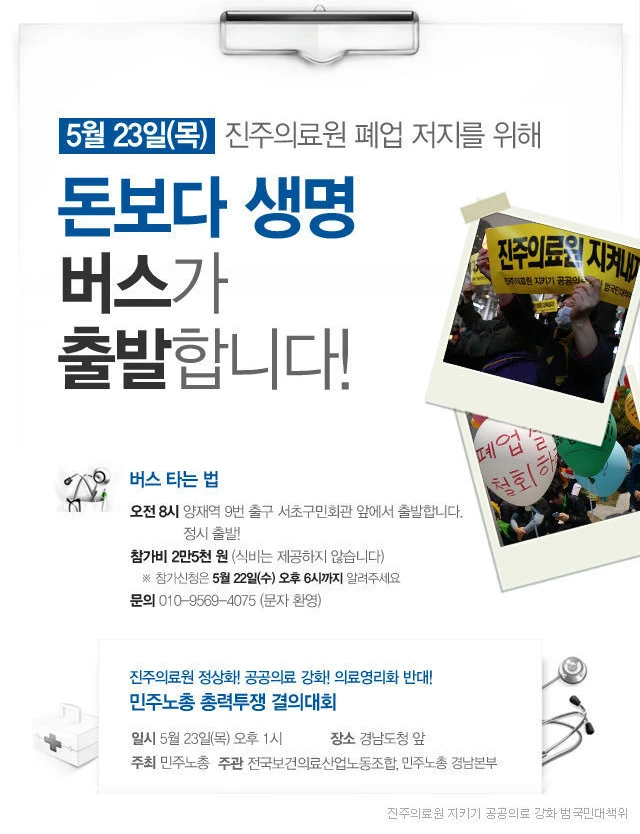 5월 23일(목) 진주의료원 폐업 저지를 위해 돈보다 생명 버스가 출발합니다!