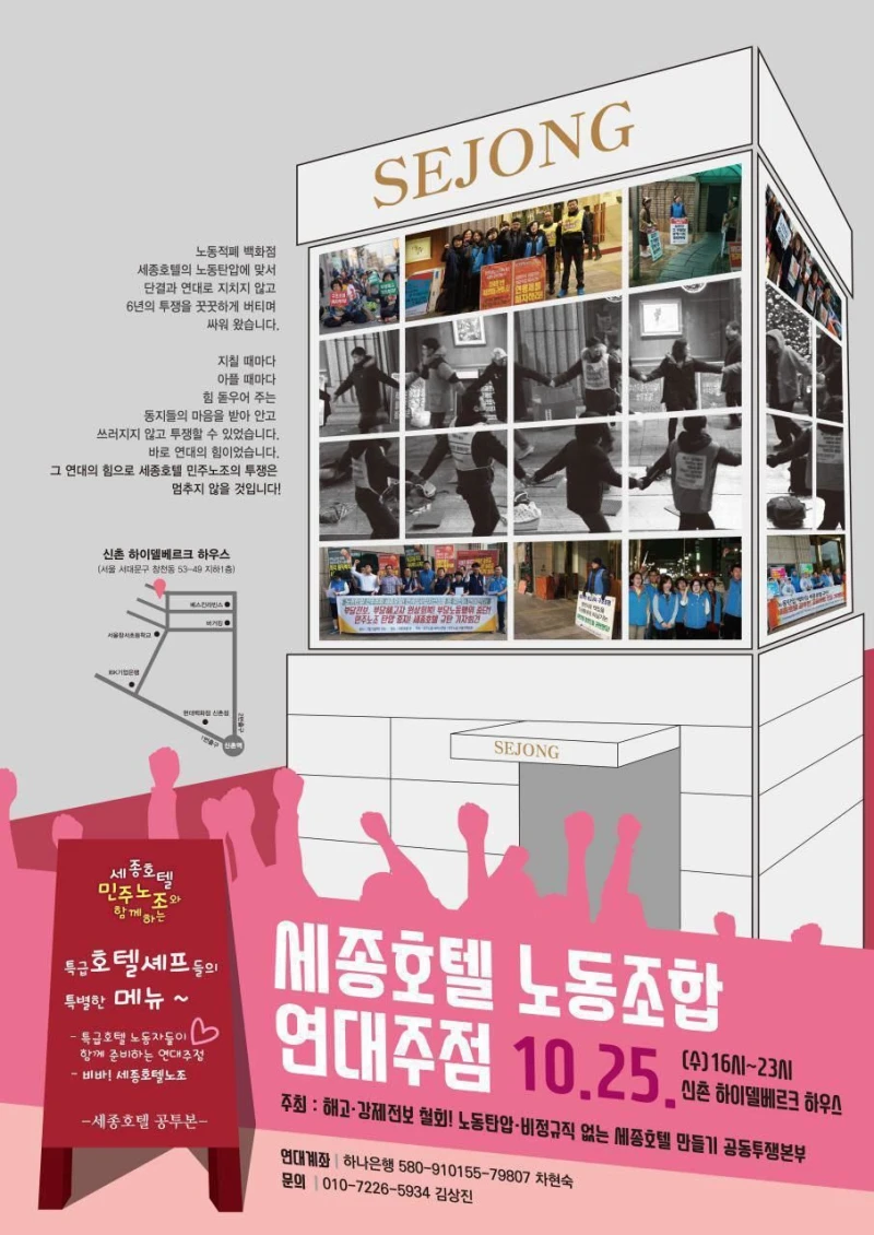 노동적폐 백화점 세종호텔의 노동탄압에 맞서 단결과 연대로 지치지 않고 6년의 투쟁을 꿋꿋하게 버티며 싸워 왔습니다.