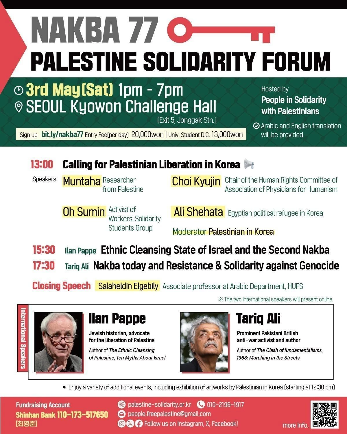 | 13:00 | Calling for Palestinian Liberation in Korea Speakers: - Muntaha, Researcher from Palestine - Choi Kyujin, Chair of the Human Rights Committee of Association of Physicians for Humanism - Oh Sumin, Activist of Workers' Solidarity Students Group - Ali Shehata, Egyptian political refugee in Korea Moderator: Palestinian in Korea |