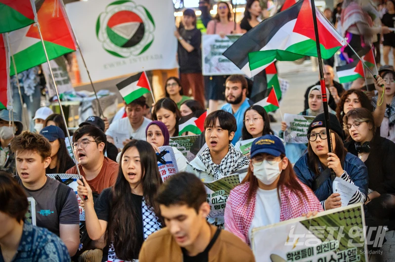 고려대 쿠피예, 서울대 수박, 이화여대 인티파다, 연세대 얄라연세 등 국내 팔레스타인 연대 대학 동아리들이 주최한 이날 집회에는 한국뿐 아니라 팔레스타인, 수단, 이탈리아, 독일 등 다양한 배경의 학생들이 모여 “Free Palestine!”을 외쳤다.