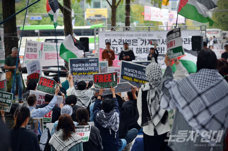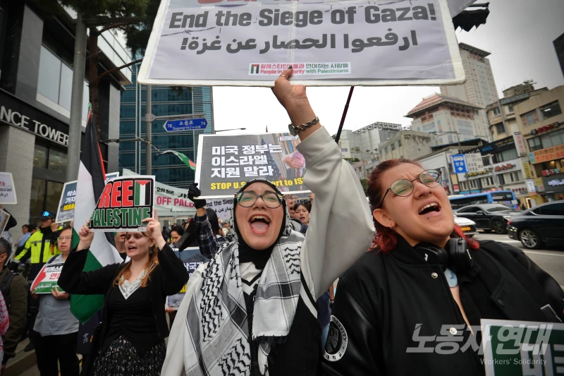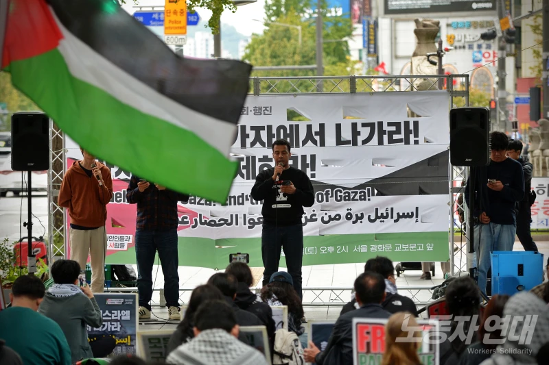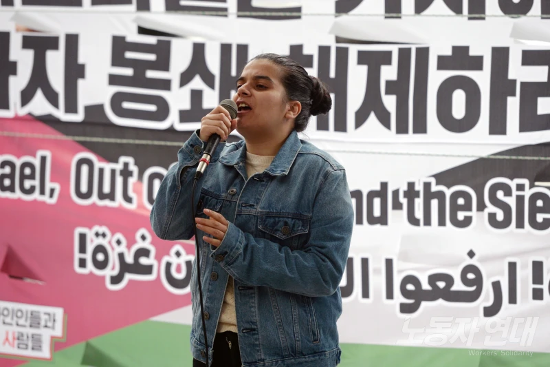 재한 팔레스타인인 나리만 씨는 “숨이 멈추기 전까지 저항을 멈추지 않을 것”이라고 연설하며 이스라엘의 잔인함을 맹렬히 폭로했다.