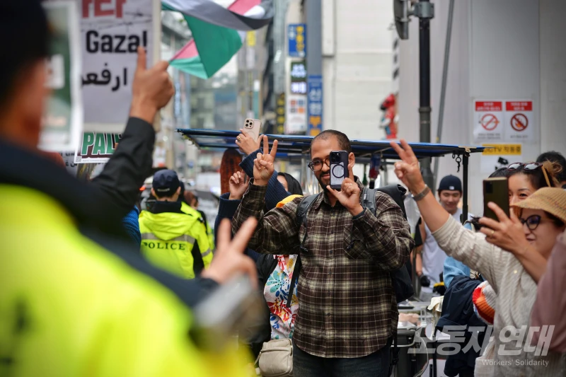 행진에 나선 집회 참가자들은 이스라엘 대사관 앞을 거쳐 을지로와 명동으로 도심을 헤집고 다녔다.