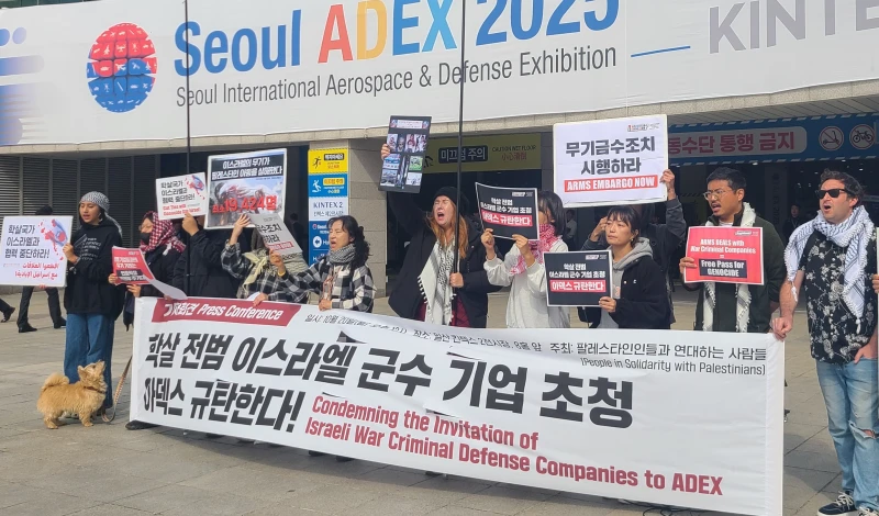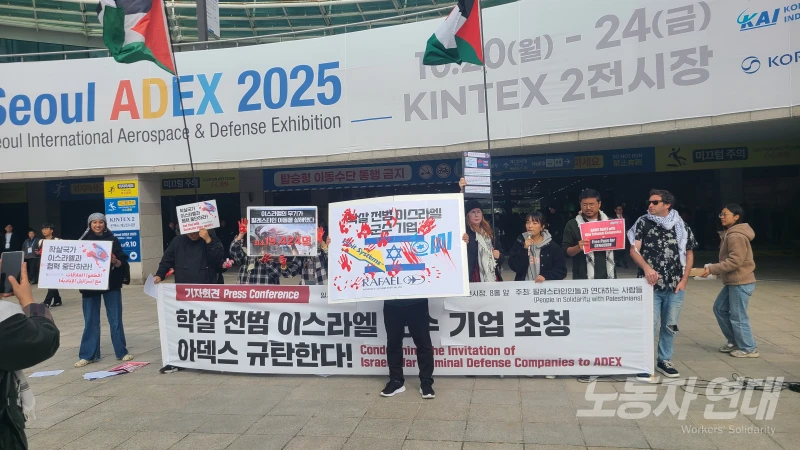 10월 20일 ‘팔레스타인인들과 연대하는 사람들’ 활동가들은 ‘서울 국제 항공우주 및 방위산업 전시회’(ADEX, 이하 “아덱스”)가 열리는 일산 킨텍스 전시관 입구에서 항의 기자회견을 열었다.