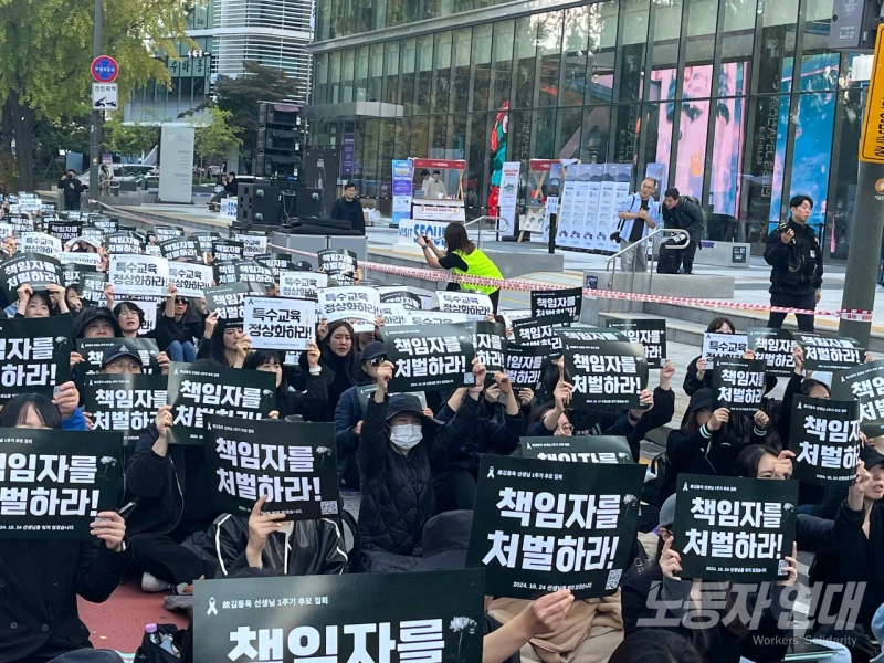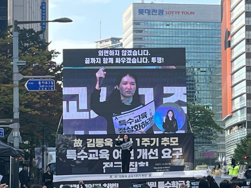 10월 25일(토) 서울 광통교 인근에서 교사 1000여 명이 모여 지난 해 10월 24일 생을 달리한 고(故) 김동욱 교사 1주기를 추모하고 특수교육 정상화와 책임자 처벌을 외쳤다.