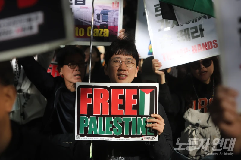 이재명 정부는 이스라엘 기업들을 무기 박람회에 초청하고 학살 공범 트럼프에게 왕관을 씌워 주면서, 팔레스타인 연대 시위가 두 학살 국가의 공관에 항의를 표하는 것은 가로막은 것이다.