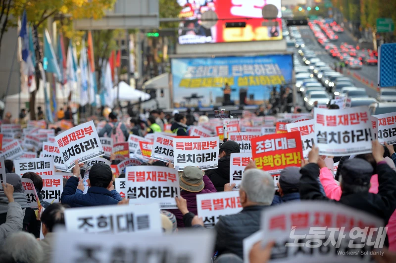 ⓒ이미진 [사진]조희대 탄핵 촉구, 대법원 앞 촛불행동 사법부 규탄 집회 촛불행동이 11월 15일 오후 서울 서초구 대법원 인근에서 ‘내란청산 국민주권실현 165차 촛불대행진’을 열고 조희대 사법부를 규탄하고 있다. 전국에서 모인 수천명의 참가자들은 박성재 전 법무장관과 황교안 전 총리의 잇따른 구속 영장 기각을 규탄하며, 쿠데타 세력 비호하는 조희대 대법원장의 수사 및 탄핵, 내란특별재판부 설치 등을 요구했다. ⓒ〈노동자 연대〉 이미진