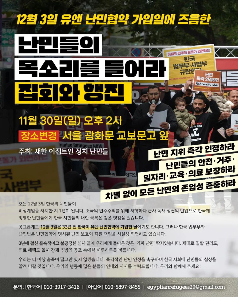 재한 이집트인 정치 난민들이 한국의 유엔 난민협약 가입일(12월 3일)을 앞둔 11월 30일(일) 서울 도심에서 집회와 행진을 개최한다. 이들은 한국 법무부와 사법부에 자신들의 난민 지위 인정과 난민들이 인간다운 삶을 살 수 있는 여건을 보장하라고 요구할 예정이다.