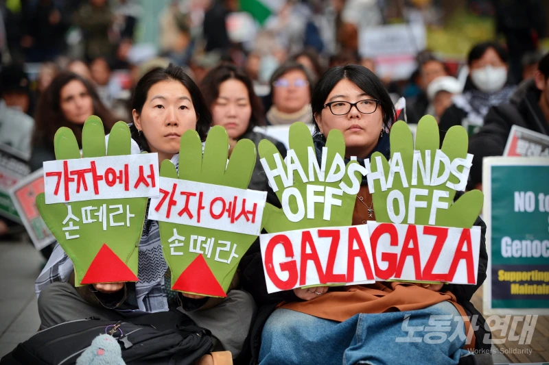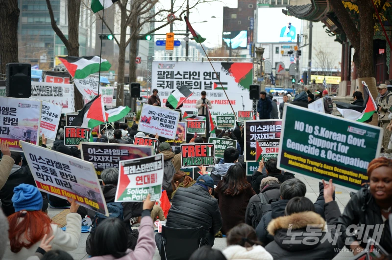 “‘가자지구 그린존’ 운운하는 저들의 위선과 사기극은 오늘 행동과 같은 국제 연대에 의해 파묻힐 것입니다.”