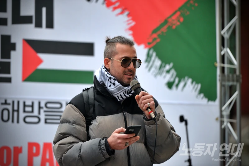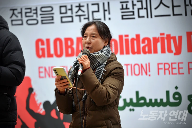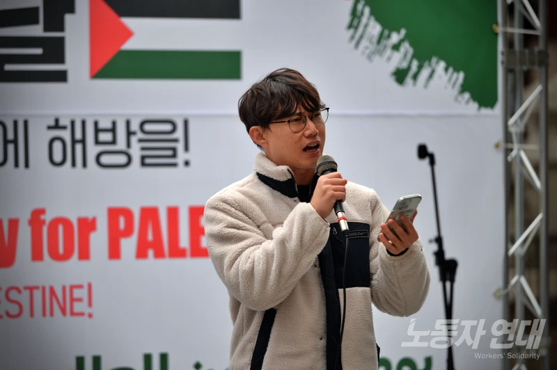 “이스라엘을 돕는 살인 기업들이 그 수혜를 누리고 있습니다. 한화시스템, 현대로템, KAI 등은 이스라엘 군사 기업들과 협력해 이스라엘의 무장을 강화시켜 주고 있습니다. 인종학살 공범 구실을 하고 있는 것입니다!”