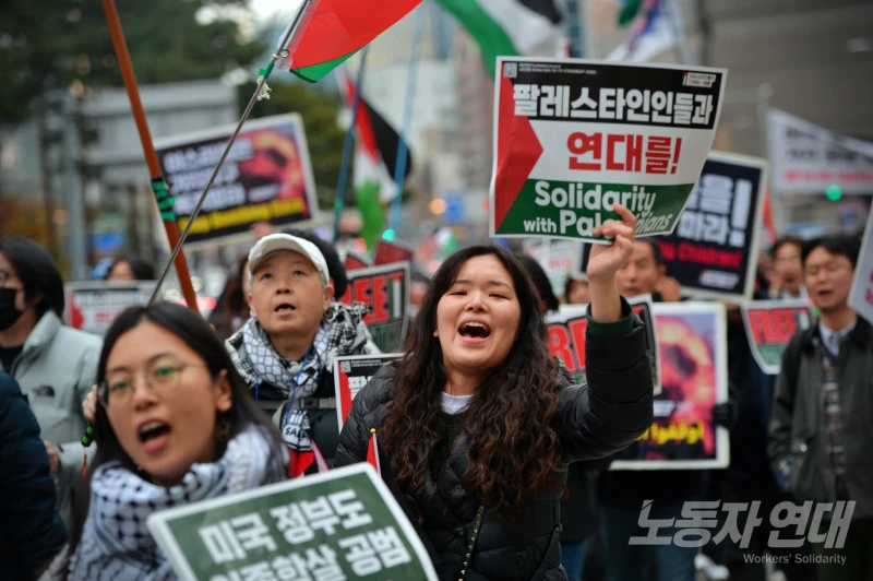 “모든 것을 봉쇄하라“ 구호는 ‘팔레스타인인들과 연대하는 사람들’(팔연사)이 주최한 국제 행동의 날 서울 집회에서도 울려 퍼졌다.