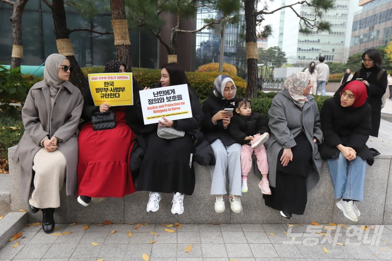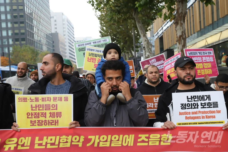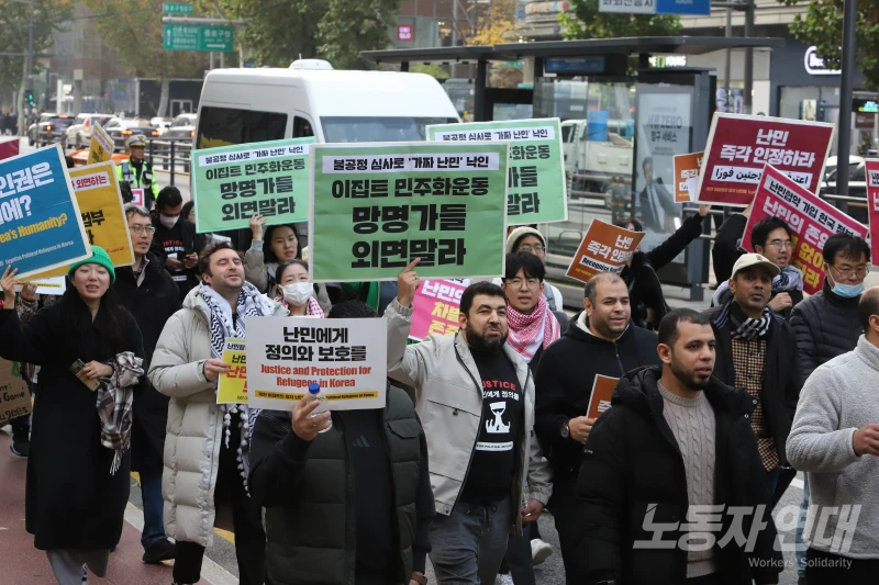 난민들과 한국인들, 다양한 이주 배경 사람들이 아랍어와 한국어가 함께 적힌 팻말을 들고 한데 어우러져 구호를 외치는 모습이 거리 시민들의 시선을 한눈에 사로잡았다.