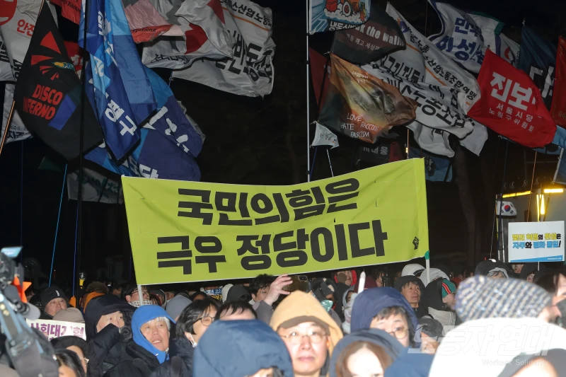 영하의 날씨 속에서 참가자들은 집회를 끝마치고 국힘 당사 앞으로 행진을 시작했다.
