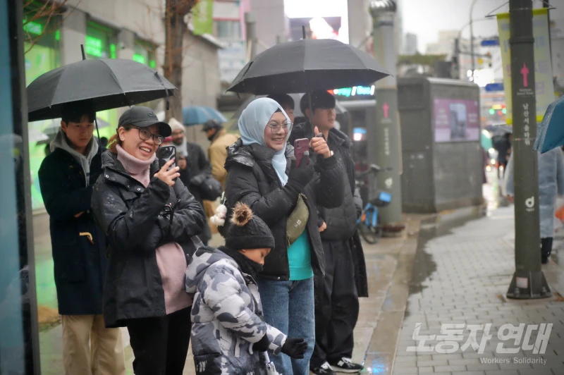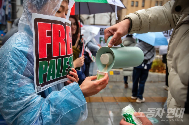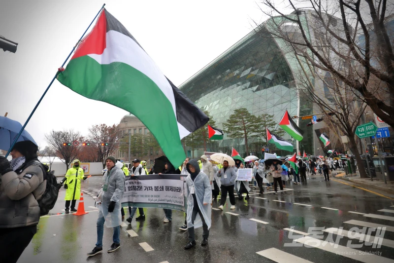 서울시청을 거쳐 명동까지 행진하는 대열에 행인들은 관심과 호응을 보냈다. 쓰고 있던 우산을 내리고 손을 흔드는 청년, 바퀴 달린 여행가방을 끌고 대열을 따라 걸으며 “프리 팔레스타인”을 함께 외치는 관광객들도 있었다.