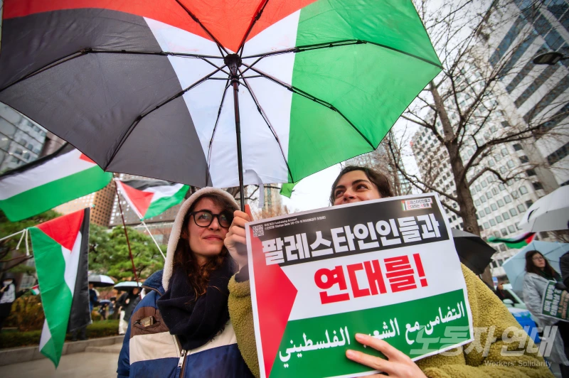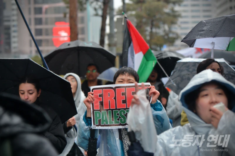 빗방울이 흩뿌리는 쌀쌀한 날씨에도 광화문 교보문고 앞을 메운 참가자들은 이스라엘의 만행과, 가자지구에 국제 군대를 투입하겠다는 트럼프의 점령 구상을 비판했다.