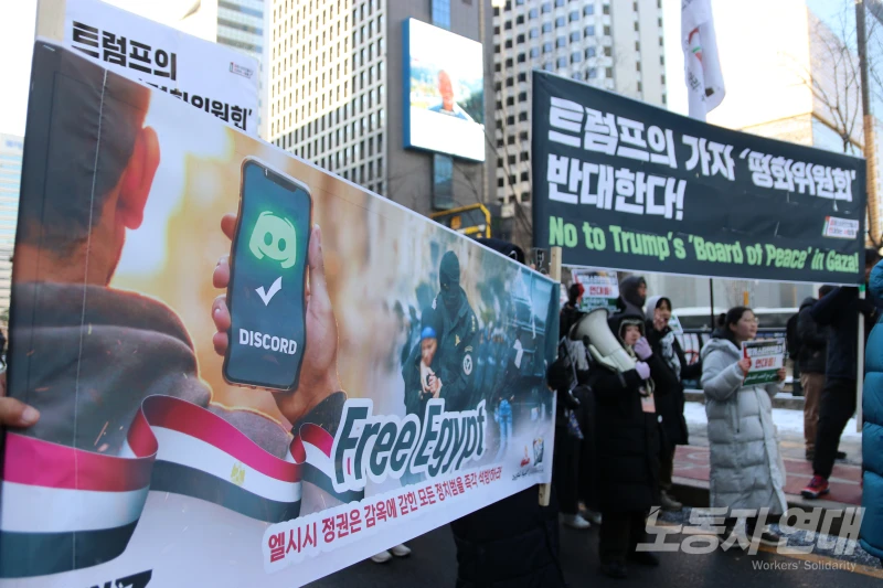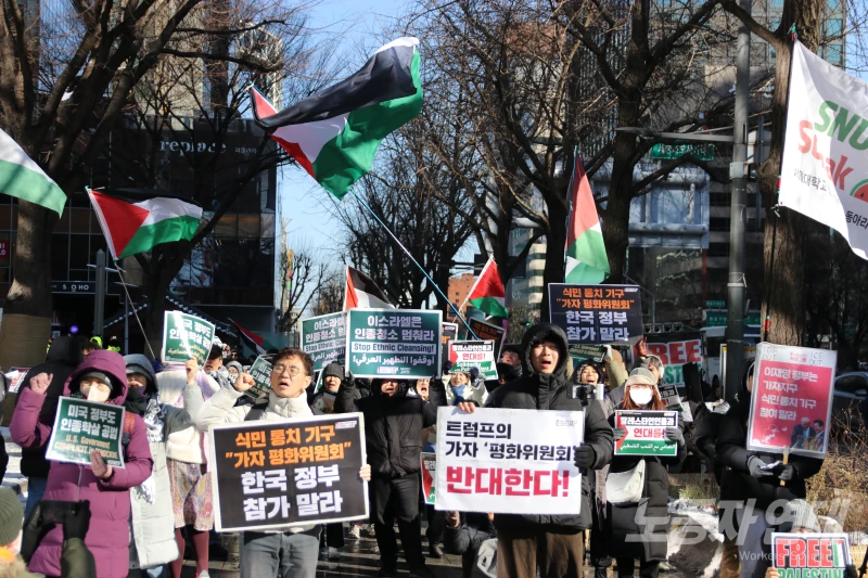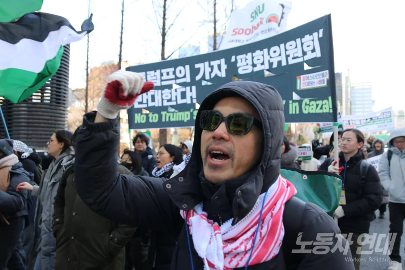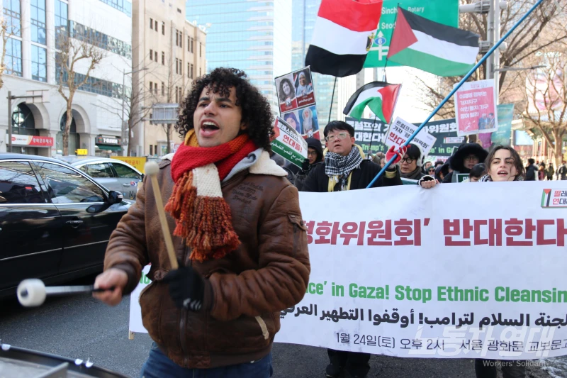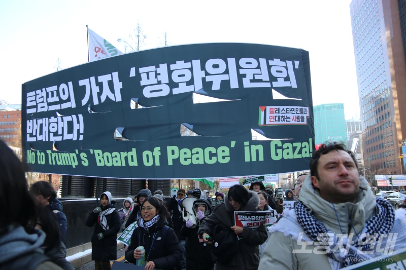 집회를 마친 참가자들은 도심 행진에 나섰다. 대열은 종로와 광화문을 지나며 트럼프의 ‘평화 파괴 위원회’를 규탄하고 이재명 정부가 거기에 절대 참가해서는 안 된다고 외쳤다.