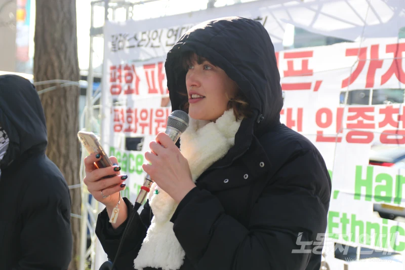 미국에서 온 팔레스타인 연대 활동가 안나 씨도 마이크를 잡고, 출범 1년이 된 트럼프 2기 정부가 거짓말과 부정의로 점철돼 있었음을 조목조목 지적하는 발언을 했다.