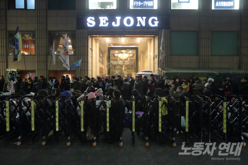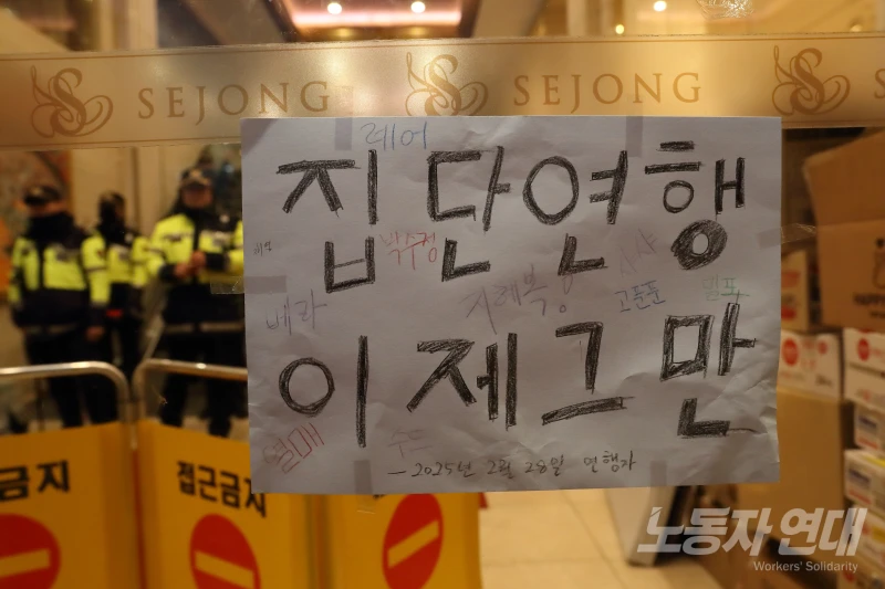2월 2일 오전 경찰이 급습해 세종호텔 로비에서 농성하던 노동자와 시민 12명을 연행했다. 336일 동안 고공 농성을 한 고진수 세종호텔노조 지부장과 허지희 사무장도 그중 일부였다. “노동 존중”을 말했던 이재명 정부가 노동자 투쟁 현장을 침탈한 것이다. 연행된 사람들은 지난 코로나19 팬데믹 당시 해고된 노동자들의 복직을 요구하며 농성을 벌이고 있었다.
