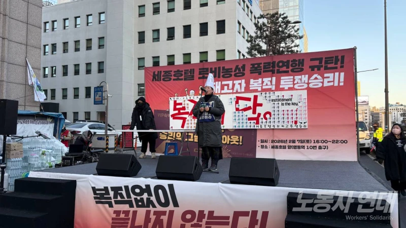 이 날 집회는 2월 2일 세종호텔 해고자와 연대 시민 12명을 폭력 연행하고, 심지어 336일 만에 고공에서 내려온 고진수 지부장을 20일 만에 구속시키려 한 이재명 정부를 규탄하고 해고자 복직을 지지 응원하기 위한 집중 행동이었다.