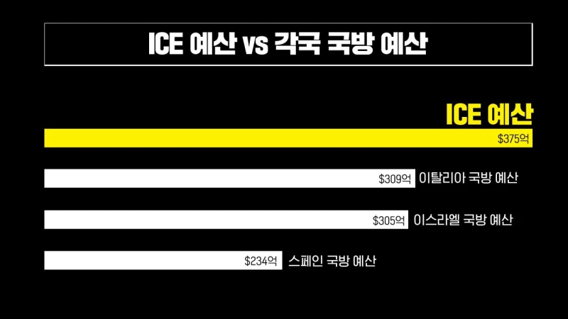 이 수치가 얼마나 말이 안 되냐면, 이민세관단속국 단일 기구의 예산이 이탈리아, 이스라엘, 스페인 등 다른 나라 국방비보다 큽니다. 이제 이민세관단속국은 미국의 사법 기관 중 가장 많은 예산이 배정된 기구가 됐습니다.