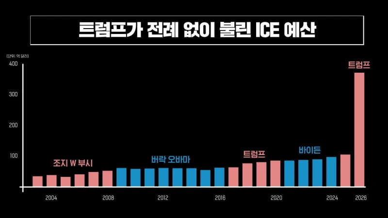 그러나 트럼프 2기 출범 전까지, 이민세관단속국은 큰 존재감이 없었습니다. 10년 전만 해도 이민세관단속국 예산은 연간 60억 달러 미만이었습니다. 이후 2024년까지 100억 달러 규모로 늘었습니다. 그러나 트럼프 2기가 시작되면서부터 예산이 세 배 이상 늘어서 2026년 예산은 연간 370억 달러 수준입니다.