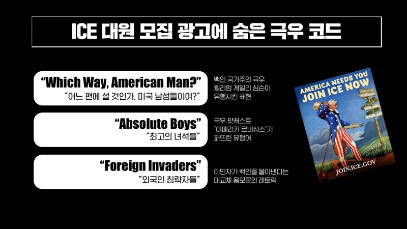 여기 보이는 그림이 이민세관단속국 요원 모집 홍보 포스터입니다. “미국인이여, 어느 길로 갈 것인가?”라는 홍보 문구는 백인 국가주의자 소설가 윌리엄 게일리 심슨의 소설에서 빌려 온 것입니다. 다른 광고에 쓰이는 “최고의 녀석들”이라는 단어는 ‘아메리칸 르네상스’라는 극우 팟캐스트가 유행시킨 속어입니다.
