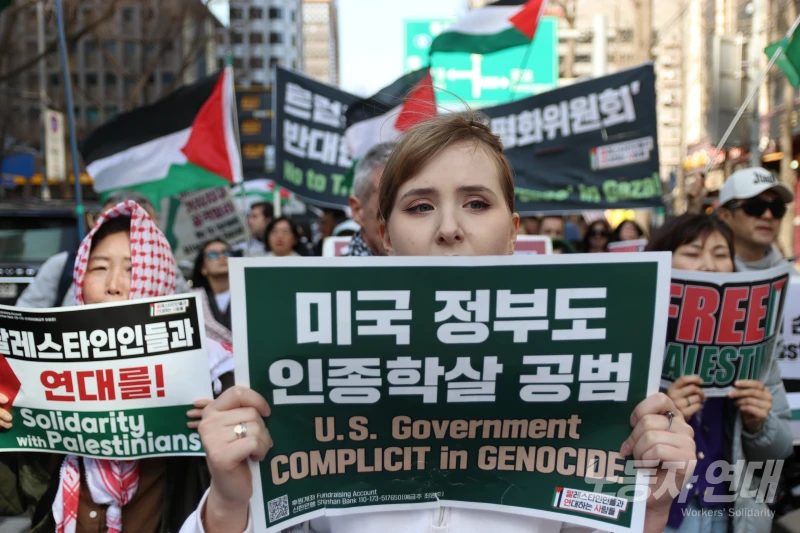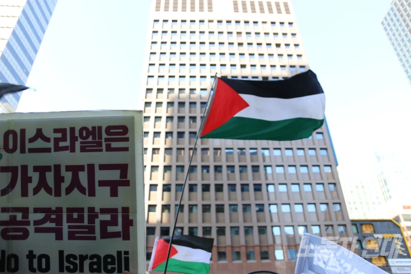“그런데 이재명 정부는 이 이사회 회의에 참여하고, 그뿐 아니라 일본이 주도하는 ‘재건 기금 마련 모금’에도 참여한다고 합니다. 이재명 정부가 인종청소와 식민 지배의 일부가 되려 하는 데에 강력히 항의합시다!” 참가자들도 구호를 외치고 팔레스타인 깃발을 흔들며 화답했다.
