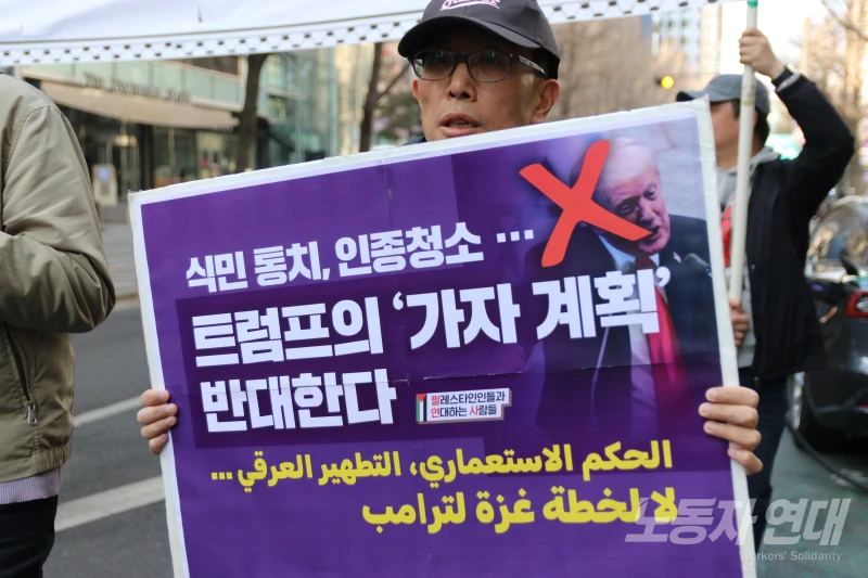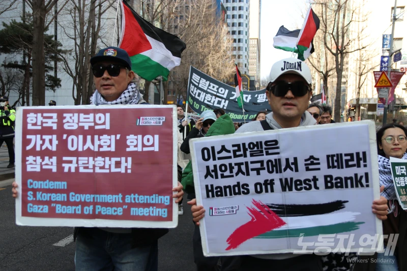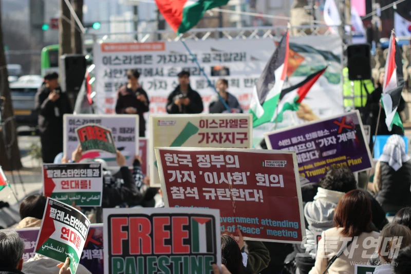 이날 집회는 이재명 정부가 트럼프의 가자 ‘평화 이사회’에 옵서버를 파견한 지 이틀 후 열렸다. 사회자는 집회를 시작하며 이재명 정부를 매섭게 규탄했다.