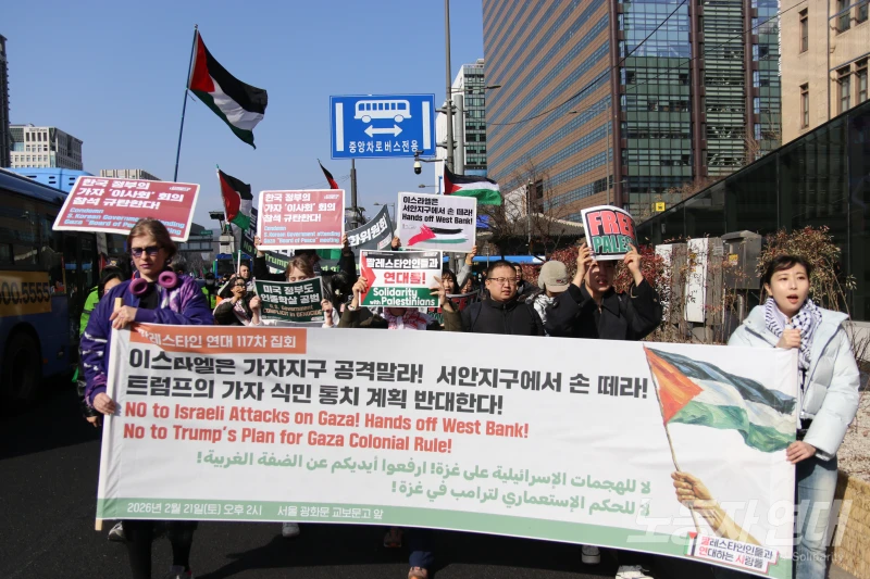 2월 21일 서울 광화문 교보문고 앞에서 열린 ‘팔레스타인인들과 연대하는 사람들’(이하 팔연사) 주최 117차 서울 집회에 모인 참가자들의 표정은 밝았다. 연휴가 끝나고 2주 만에 모인 연대자들은 반갑게 서로 인사를 나눴다.