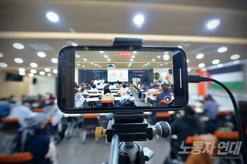 강연회 막바지에 미국과 이스라엘이 이란을 공격하기 시작했다는 속보가 나오자 팔연사 공동간사인 재한 팔레스타인인 나리만 씨가 긴급 공지를 했다.