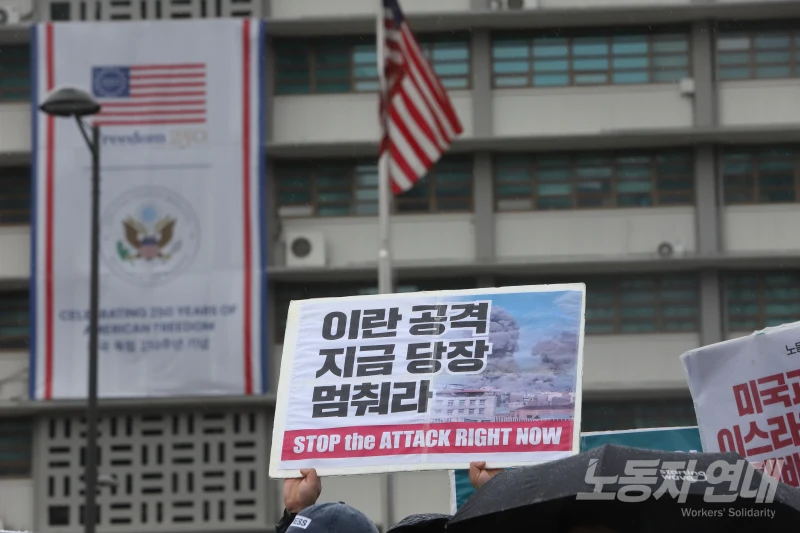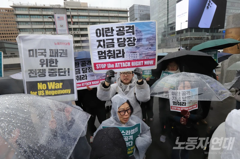 미국·이스라엘의 이란 공격에 대한 공분이 국제적으로 일고 세계 여러 나라에서 항의 행동이 벌어지는 가운데, 한국에서도 3월 2일(월) 정오 주한 미국 대사관 앞에서 긴급 행동이 열렸다. 비바람이 부는 악천후에도 100명 가까이 참가했다.
