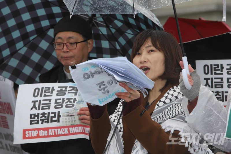 “미국과 이스라엘이 승리하면 이스라엘은 팔레스타인인 인종학살에 더 박차를 가할 것이고, 자신감을 얻은 트럼프는 쇠락하는 미국의 패권을 지키기 위해 더 위험천만한 모험을 감행할 것입니다. 이는 이곳 한반도도 위험에 빠뜨릴 것입니다.”