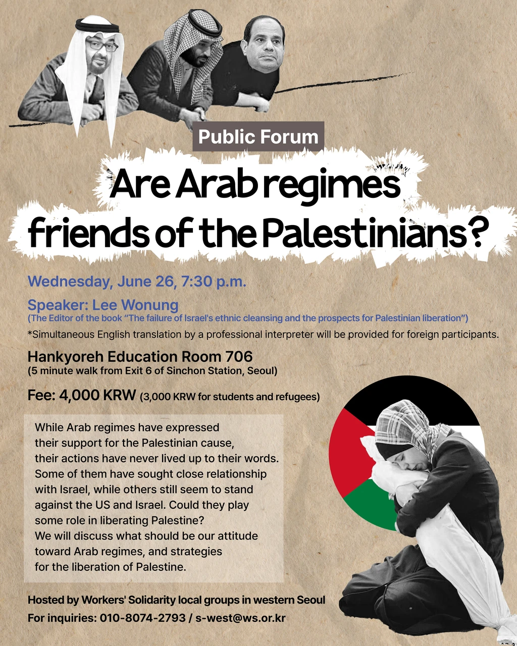 While Arab regimes have expressed their support for the Palestinian cause, their actions have never lived up to their words. Some of them have sought close relationship with Israel, while others still seem to stand against the US and Israel. Could they play some role in liberating Palestine? We will discuss what should be our attitude toward Arab regimes, and strategies for the liberation of Palestine.