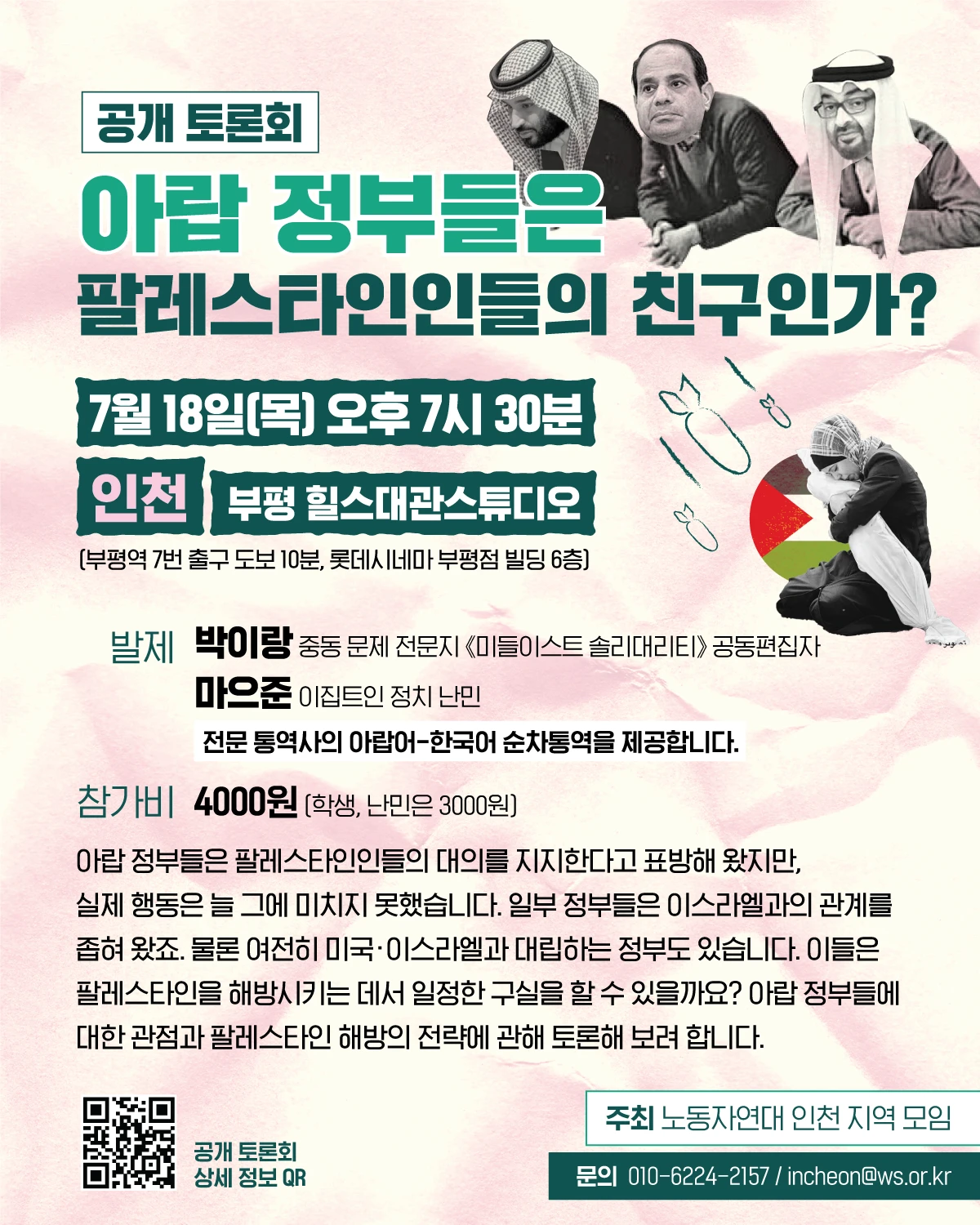 아랍 정부들은 팔레스타인인들의 대의를 지지한다고 표방해 왔지만, 실제 행동은 늘 그에 미치지 못했습니다. 일부 정부들은 이스라엘과의 관계를 좁혀 왔죠. 물론 여전히 미국·이스라엘과 대립하는 정부도 있습니다. 이들은 팔레스타인을 해방시키는 데서 일정한 구실을 할 수 있을까요? 아랍 정부들에 대한 관점과 팔레스타인 해방의 전략에 관해 토론해 보려 합니다.
