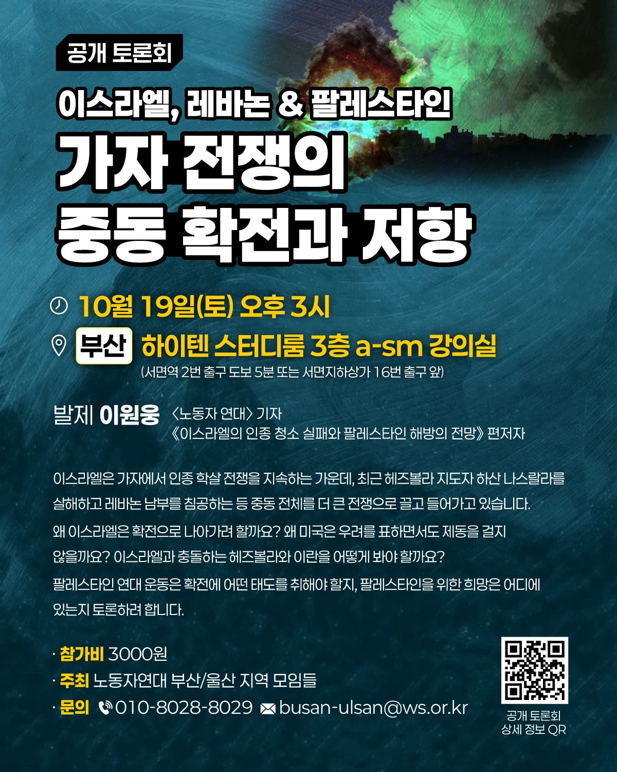 👉 [공개 토론회] 이스라엘, 레바논 & 팔레스타인: 가자 전쟁의 중동 확전과 저항 https://ws.or.kr/forum/33407 📌 일시: 2024년 10월 19일(토) 오후 3시 📌 발제자: 이원웅 (<노동자 연대> 기자, 《이스라엘의 인종 청소 실패와 팔레스타인 해방의 전망》 편저자) 📌 장소: 부산 하이텐 스터디룸 3층 a-sm 강의실 (서면역 2번 출구 도보 5분 또는 서면지하상가 16번 출구 앞) 📌 참가비: 3000원 💬 이스라엘은 가자에서 인종 학살 전쟁을 지속하는 가운데, 최근 헤즈볼라 지도자 하산 나스랄라를 살해하고 레바논 남부를 침공하는 등 중동 전체를 더 큰 전쟁으로 끌고 들어가고 있습니다. 왜 이스라엘은 확전으로 나아가려 할까요? 왜 미국은 우려를 표하면서도 제동을 걸지 않을까요? 이스라엘과 충돌하는 헤즈볼라와 이란을 어떻게 봐야 할까요? 팔레스타인 연대 운동은 확전에 어떤 태도를 취해야 할지, 팔레스타인을 위한 희망은 어디에 있는지 토론하려 합니다. 🔺 주최: 노동자연대 부산/울산 지역 모임들 🔺 문의: 010-8028-8029 / busan-ulsan@ws.or.kr